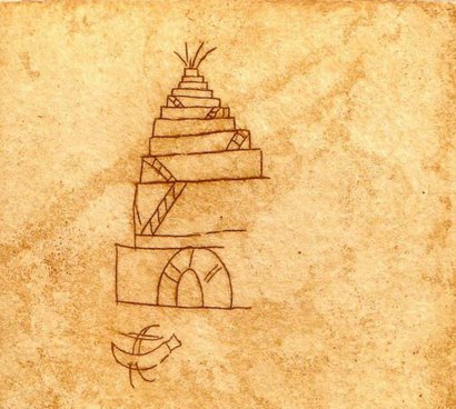 carece de puerta por ser totalmente maciza. En su cumbre hay una figura de un individuo negro, como un zinyí (negro), envuelto en una túnica de oro, que viste de manera extraña y singular (6). Tiene descubierto el hombro derecho y el brazo y la mano extendidos,