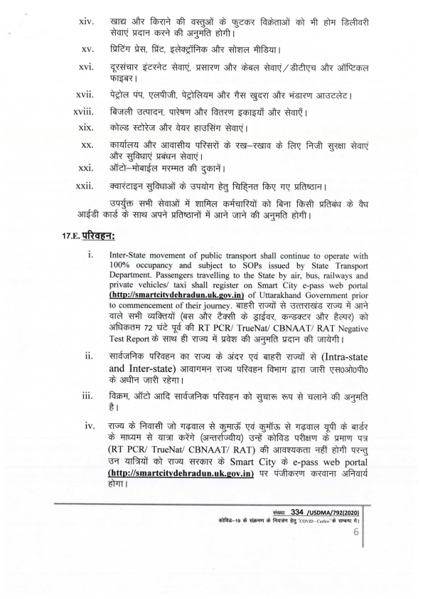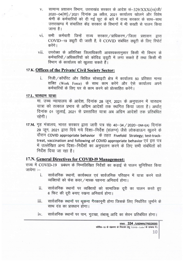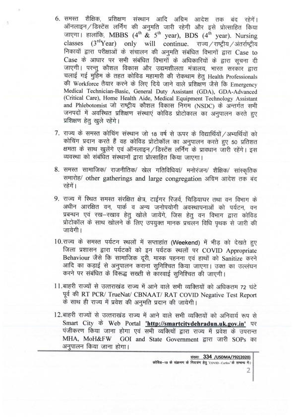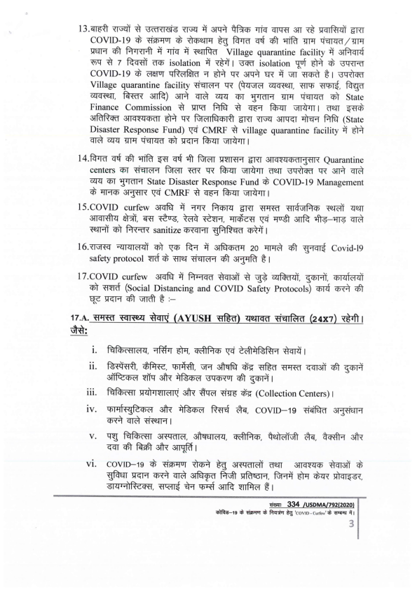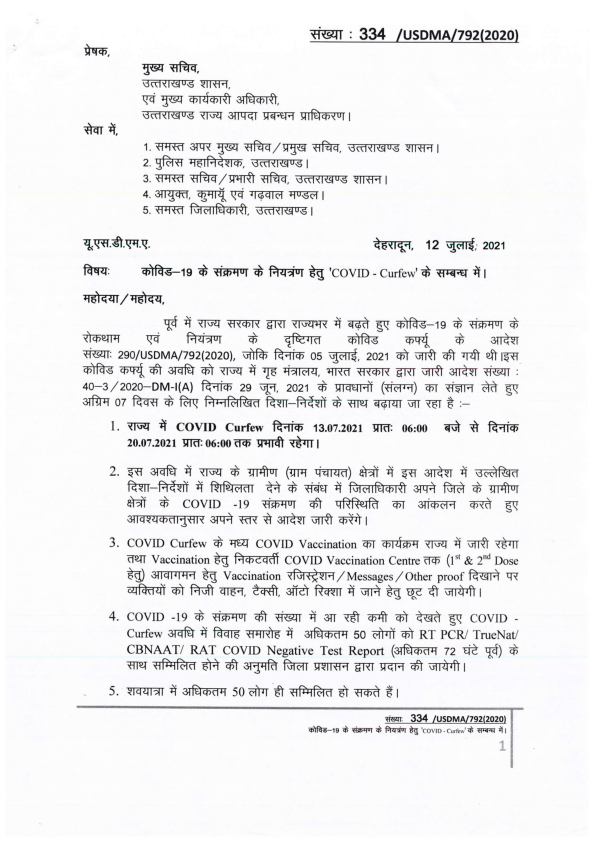 कोरोना संक्रमण की रोकथाम एवं नियंत्रण के दृष्टिगत उत्तराखण्ड शासन द्वारा दिशा-निर्देश निर्गत किये गए हैं। प्रदेश में दिनांक 13 जुलाई की प्रातः 06 बजे से 20 जुलाई की प्रातः 06 बजे तक कोविड कर्फ्यू को बढ़ाया जा रहा है। गाइडलाइन के मुख्य बिन्दु निम्नवत हैं- #CovidGuidelines