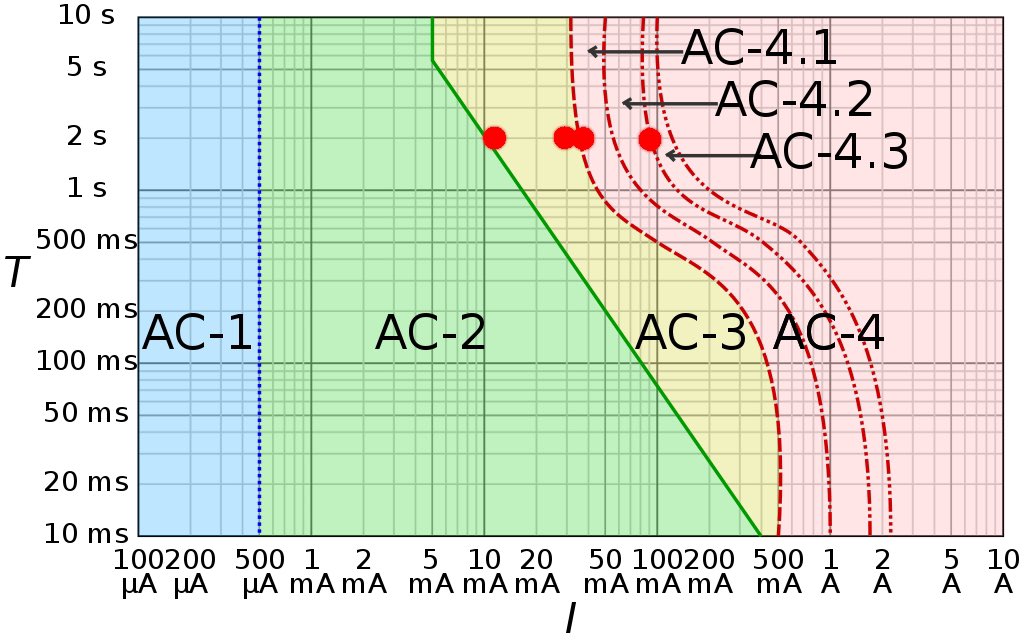 The red zone of the graph indicates irreversible effects, including possible ventricular fibrillation (irregular contractions of the heart, which can be fatal).