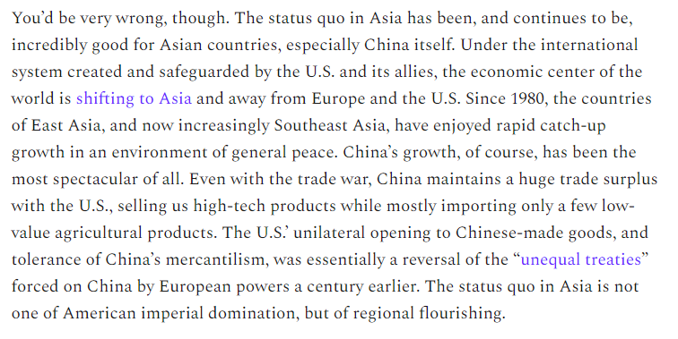 21/The status quo in Asia since 1980 has been *remarkably* good, especially for China. It has led to enormous prosperity, rapid catch-up growth, and cultural flourishing, all in an environment of peace.