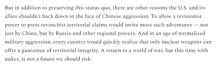 24/In addition, if China conquered Taiwan or other territory, and the U.S. stepped back and did nothing, there's a good chance it would open up a whole new global era of conquest and war -- only this time, with nukes.