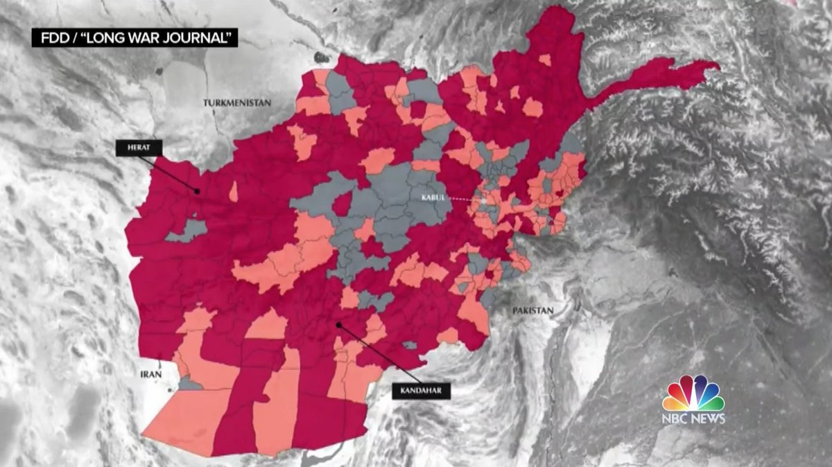 Chuck Todd splashed this scary-looking map on the screen Sunday to warn about the US withdrawal. Red = Taliban. Scary! But Chuck didn't mention that the inability of US-aligned forces to retain territory owes to a systemic flaw with the intervention itself -- not the withdrawal