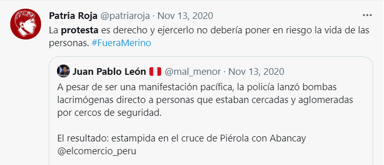 En noviembre del año pasado, sin embargo, durante las marchas en Perú, y ante el uso de gas lacrimógeno, @patriaroja🇵🇪 afirmó que "la protesta es derecho y ejercerlo no debería poner en riesgo la vida de las personas"