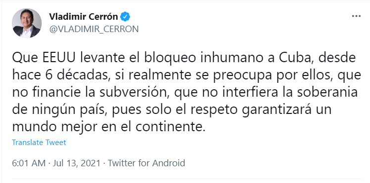 De hecho, hay fuerzas de izquierda, como el @PoloDemocratico🇨🇴 que, sin dejar de mencionar su oposición firme al embargo, han pedido al gobierno cubano diálogo y respeto al derecho a la protesta.