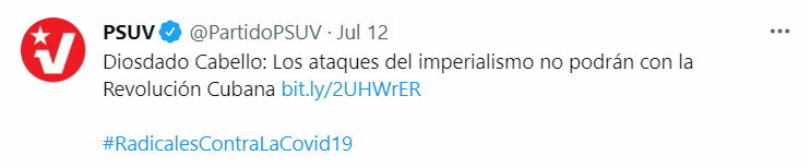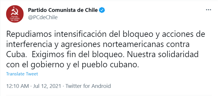 El @PCdeChile 🇨🇱, por su parte, consideró que las protestas en Cuba son "acciones de interferencia y agresiones norteamericanas", no protestas legítimas. No he encontrado ninguna mención del partido a los abusos y detenciones arbitrarias denunciadas en los últimos días