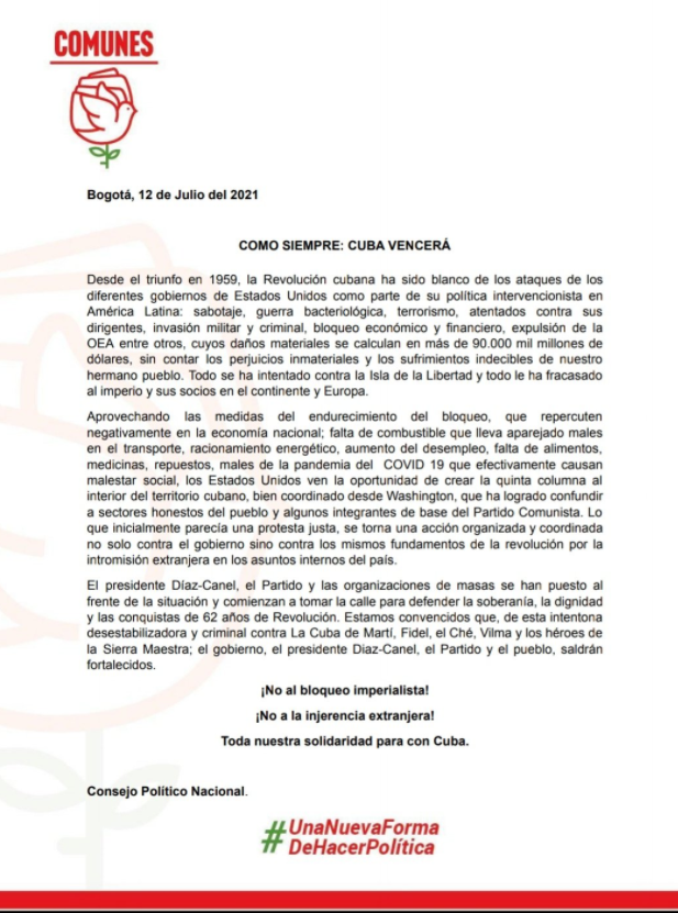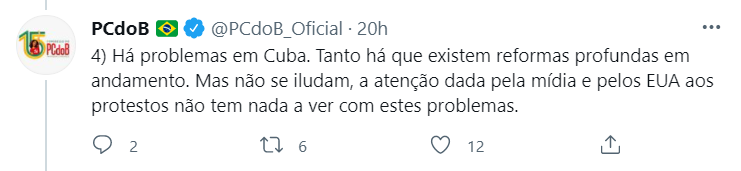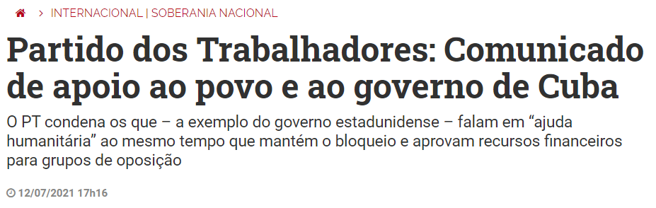 Luego de estas dos declaraciones, el partido compartió este texto, donde se señala que si bien el gob cubano "reconoce los problemas económicos", reitera que las manifestaciones "fueron alimentadas por una campaña contraria al sistema socialista" vermelho.org.br/2021/07/13/ent…