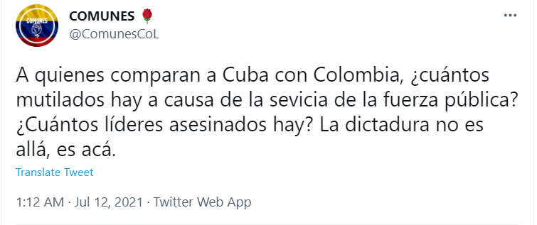 Ignorando reportes de @amnesty, que ha recogido denuncias de disparos y desaparecidos, y de @APNewsroom, que ha reportado agresiones a sus reporteros, @ComunesCoL 🇨🇴 justifica la represión del gobierno cubano, señalando que al menos "no hay mutilados ni asesinados"