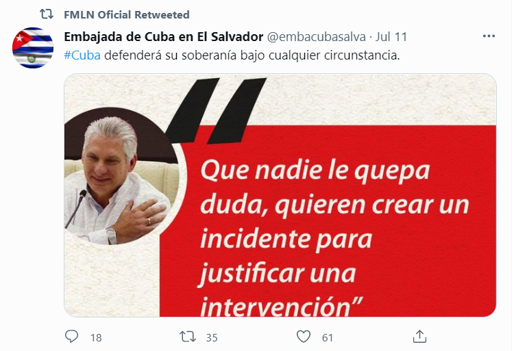 El @FMLNoficial🇸🇻 también retwiteó a la Embajada de Cuba en El Salvador, señalando que Cuba defenderá su soberanía "bajo cualquier circunstancia". Señalan tb que las protestas son "actos vandálicos instigados por el imperio contra la imbatible revolución socialista"