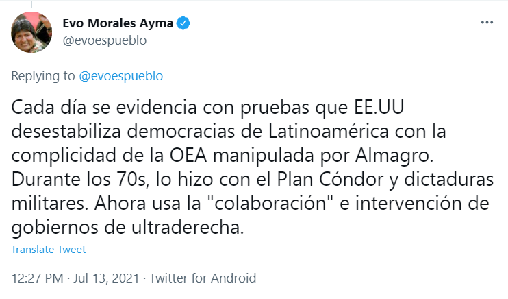 La idea de un 2do Plan Condor es compartida por Evo Morales, Presidente del @MASespueblo🇧🇴. Para Morales, las protestas son prueba del plan de EE.UU. para desestabilizar la región.