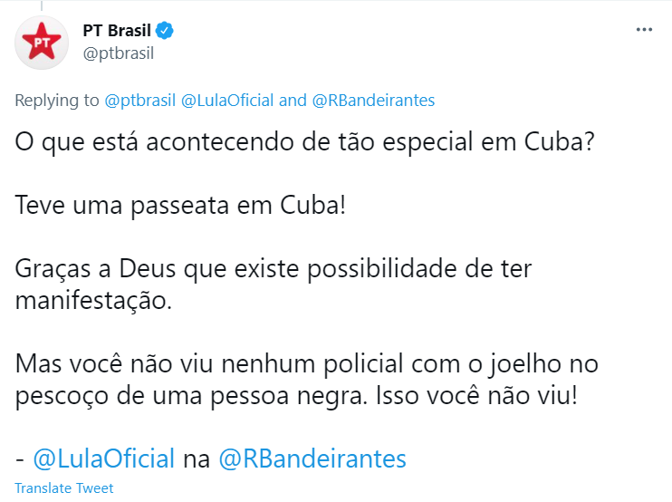 Es más, para Lula, líder del @ptbrasil🇧🇷, lo que ocurre en Cuba no tiene nada de especial. "Hubo una paseata en Cuba! Gracias a Dios que existe la posibilidad de tener una manifestación!", dijo. Ignorando a @amnesty, Lula tb minimizó la represión del gob