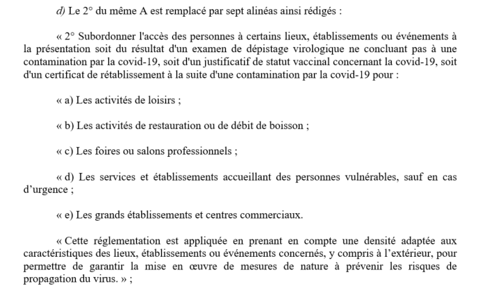 Par ailleurs, concernant le #passsanitaire, l'expression "grands rassemblements de personnes pour des activités de loisirs" devient "certains lieux, établissements ou événements". Sont -logiquement- inclus les restaurants et les grands centres commerciaux.