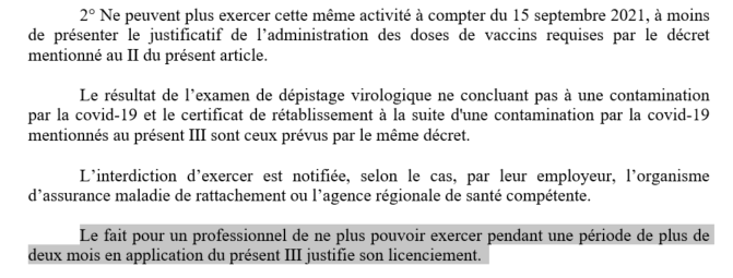 Concernant la vaccination obligatoire des soignants et de certains professionnels, à partir du 15 septembre, l'un d'eux qui passerait deux mois supplémentaires sans se faire vacciner pourra être licencié (il sera suspendu durant cet intervalle).