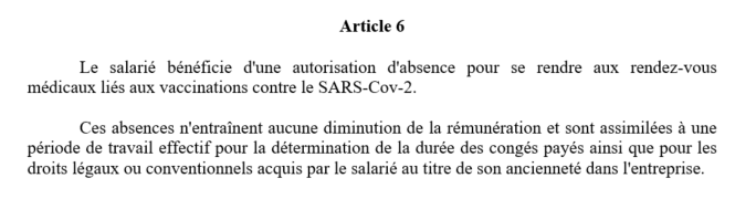 Dernier article du texte : tout salarié peut bénéficier d'une autorisation d'absence (tout en restant payé) pour aller se faire vacciner.