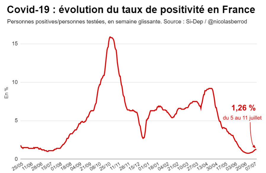 Avec 8 875 nouveaux cas positifs recensés en 24h, la France repasse déjà au-dessus des 5 000 cas par jour en moyenne sur la semaine écoulée (+81% en une semaine). #Covid19