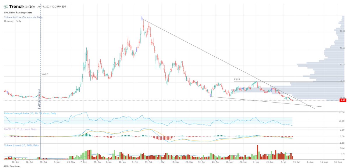$DM trading horrible, falling wedge that could take us lower but one of these days we'll find a bottom and get a breakout similar to $WISH