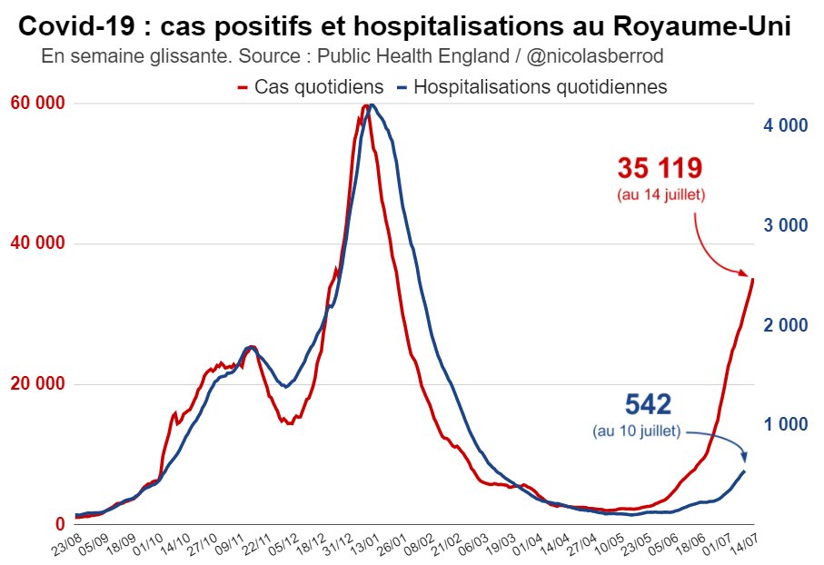 Les différents indicateurs augmentent donc au Royaume-Uni mais une chose est sûre : le ratio hospitalisés/cas positifs est bien plus faible que lors des précédents vagues, essentiellement grâce à la vaccination (et car les infectés sont surtout jeunes). 6/6