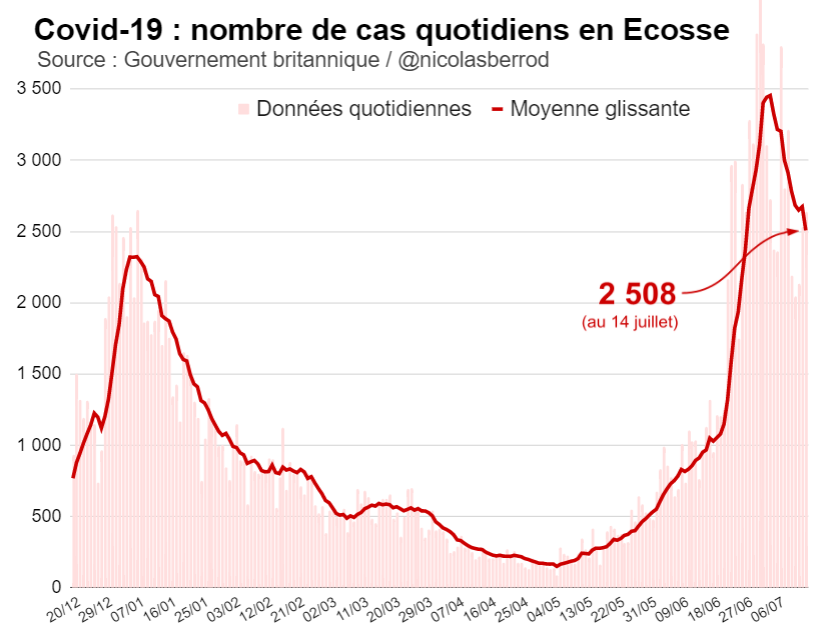 Cela s'explique notamment par le fait que le nombre de cas quotidiens est en nette chute en Écosse, l'une des quatre nations composant le Royaume-Uni. 4/6