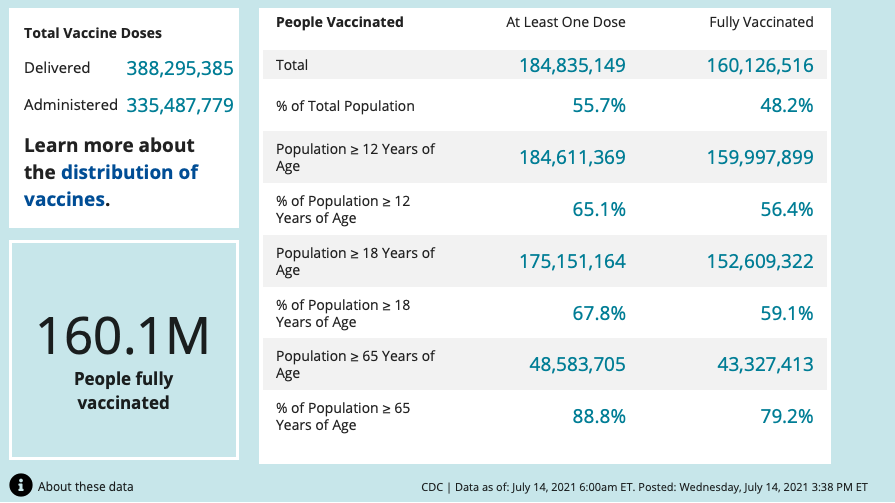 65.1% of qualified Americans (age 12 and over) have received at least one vaccine shot; 56.1% are now fully vaccinated.