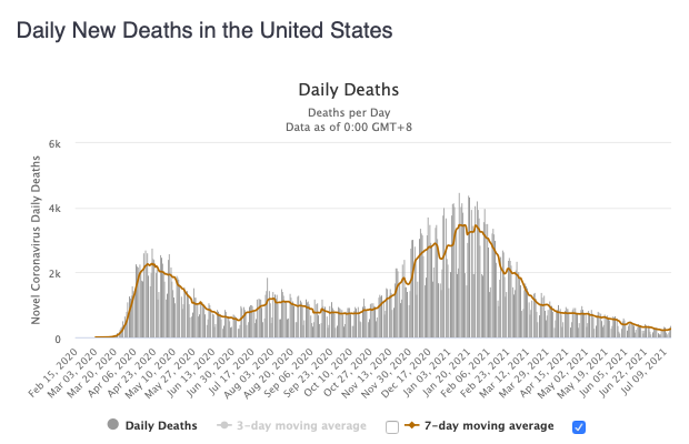 The US reported +374 new coronavirus deaths yesterday, bringing the total to 623,838. The 7-day moving average - important given the irregular daily reporting from some states - rose back to 259 deaths per day.