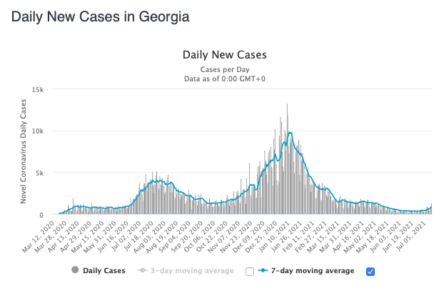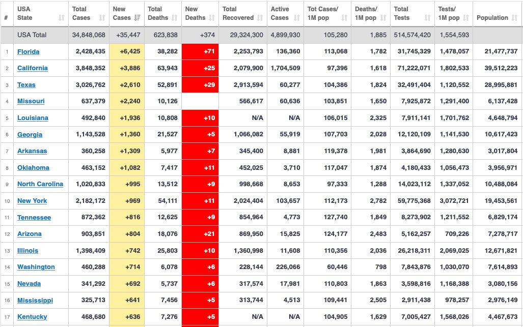 The US reported +35,447 new confirmed cases of COVID-19 yesterday, bringing the total to over 34.8 million. The 7-day moving average rose to 26,704 new cases per day, its highest since May 22.
