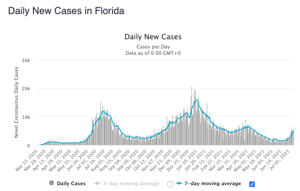 New cases in Florida are clearly spiking upwards, to over 5,000 per day, their highest since late April.