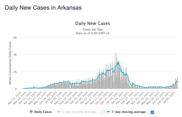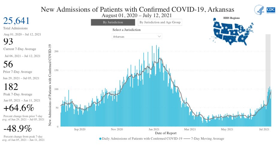 New hospital admissions in Arkansas due to COVID-19 are up +64.6% from a week ago, back to their levels in February.