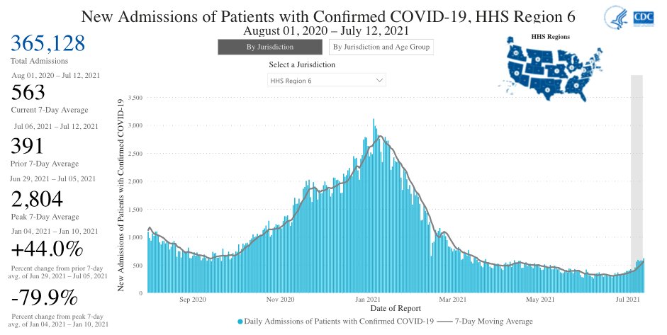 New hospitalization admissions in the south-central US, including Louisiana, Arkansas, and Texas, are up +44.0% from a week ago.