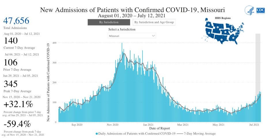 New hospital admissions in Missouri due to COVID-19 are up +32.1% from a week ago.