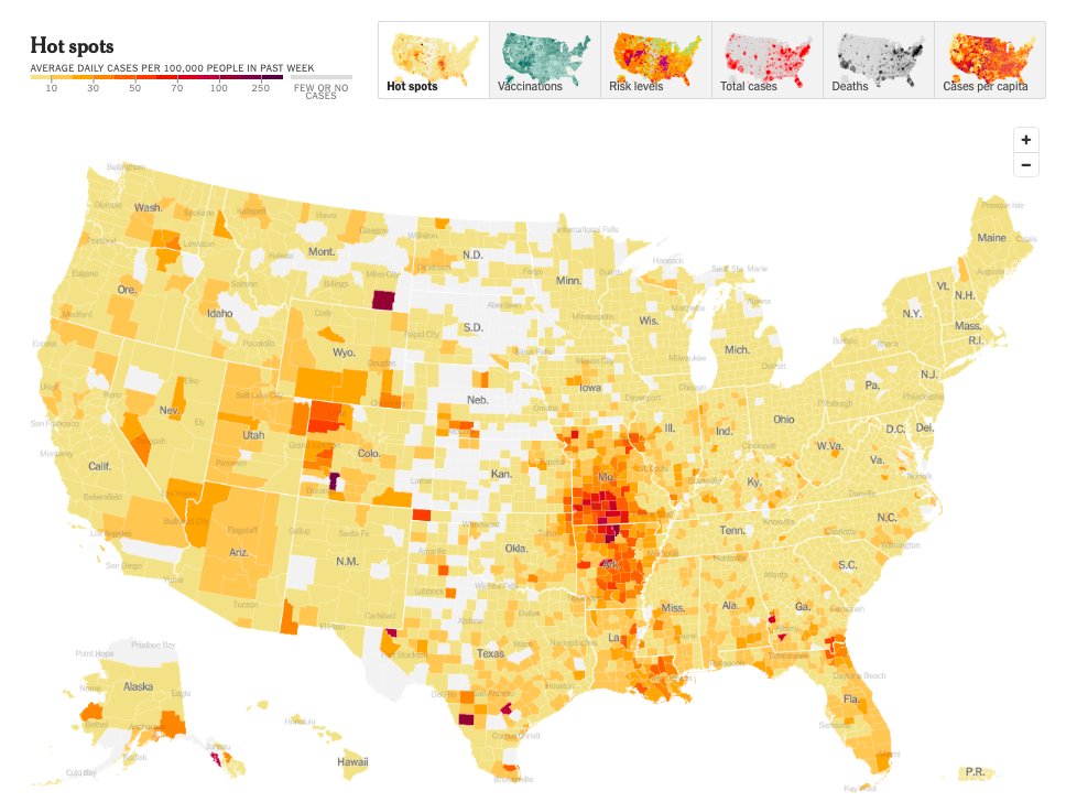 This latest map from nytimes.com shows the areas of the US that are seeing a renewed rise in COVID-19 infections, over the past week. nytimes.com/interactive/20…