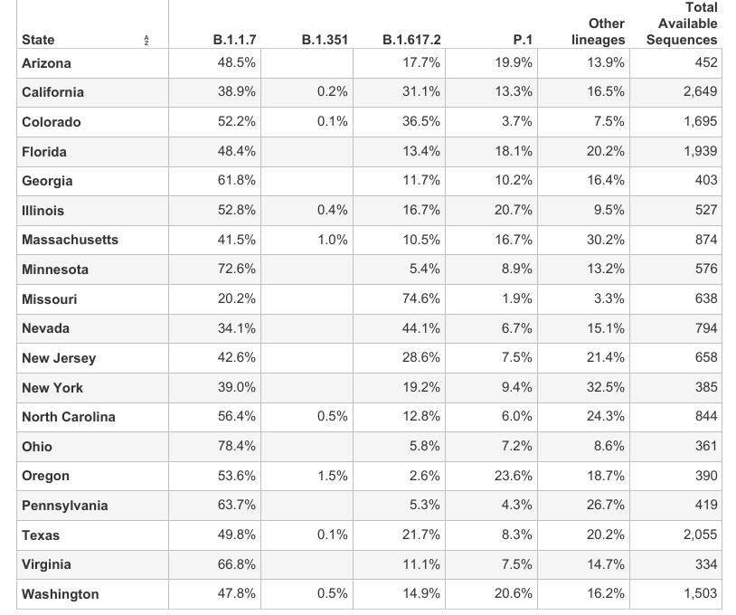 As of the latest data (early July), the Delta strain (originating in India) has become dominant in the US, accounting for over half of all new infections.