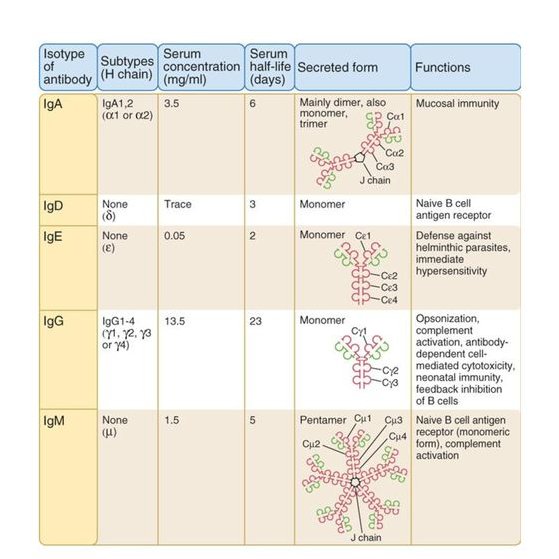 Continuando con los anticuerpos -también llamados inmunoglobulinas- es importante decir que existen 5 diferentes isotipos, y cada uno tiene una función específica. Se encuentran en