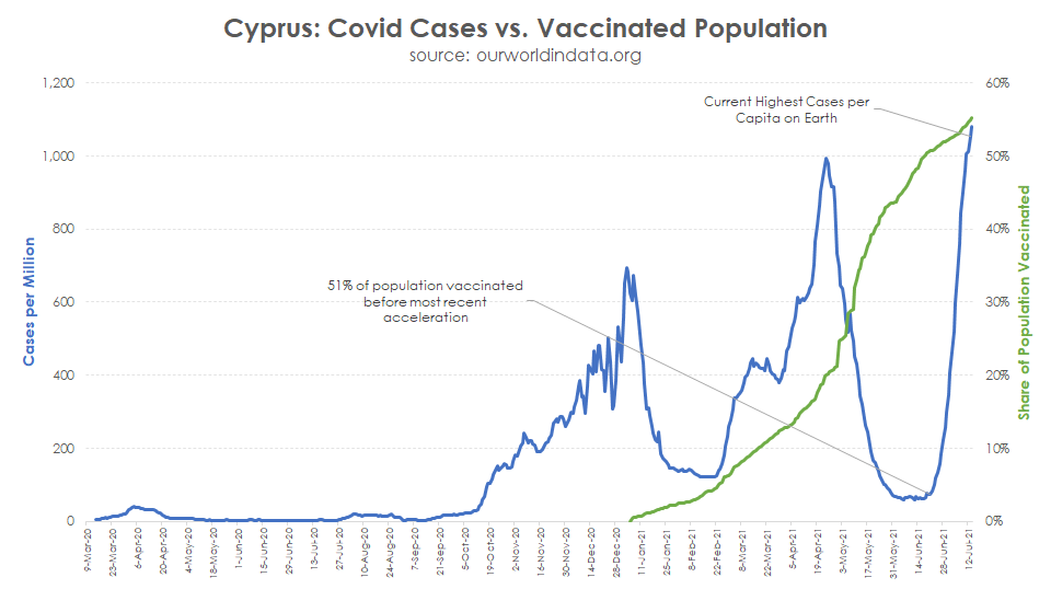 Cyprus currently has the most Covid cases per capita on Earth yet, before the most recent wave began, they had already vaccinated the majority of their adult population:
