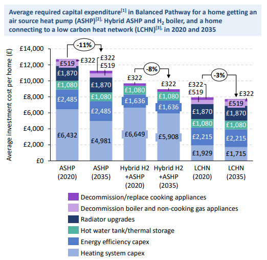 As you can see on the chart, hybrid heat pumps come out a bit cheaper in terms of upfront investment, as do heat exchange units if you connect to a local heat network.