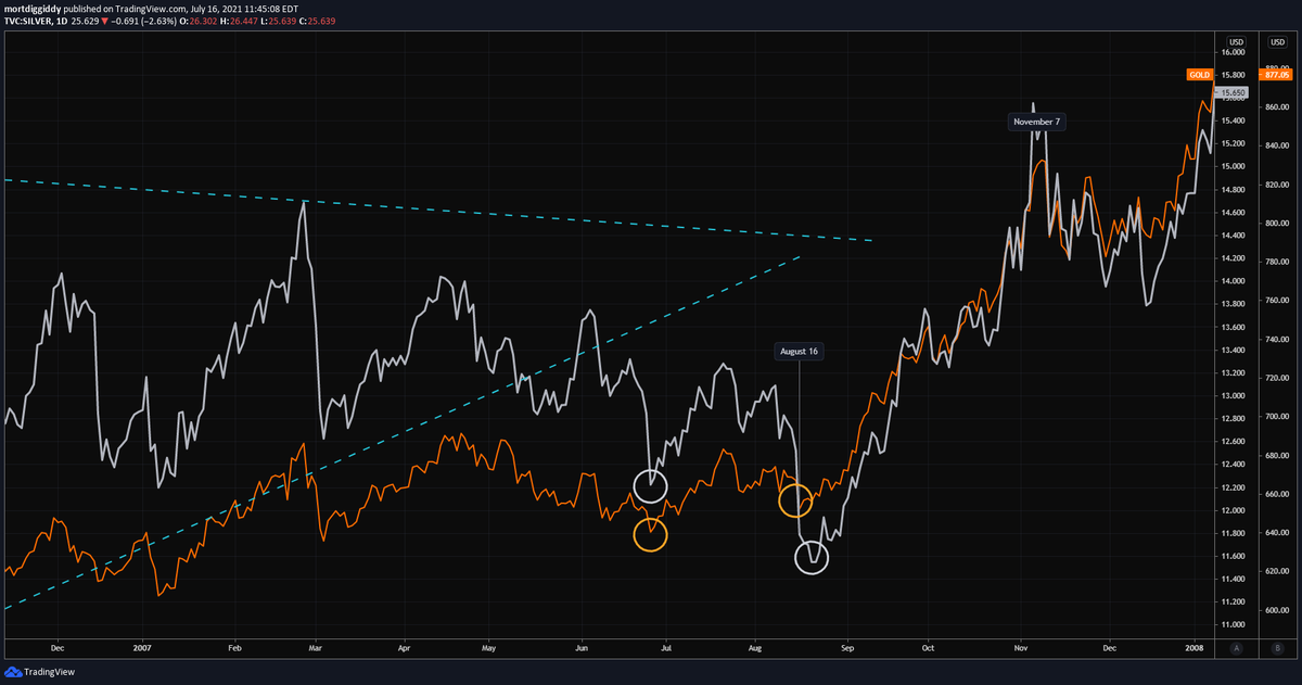 2006 saw another 1 year+ consolidation in silver. This time in August 2007 the following year the false breakdown was even more severe. On the second chart note that gold barely participated in that final selloff to August 16 2007.