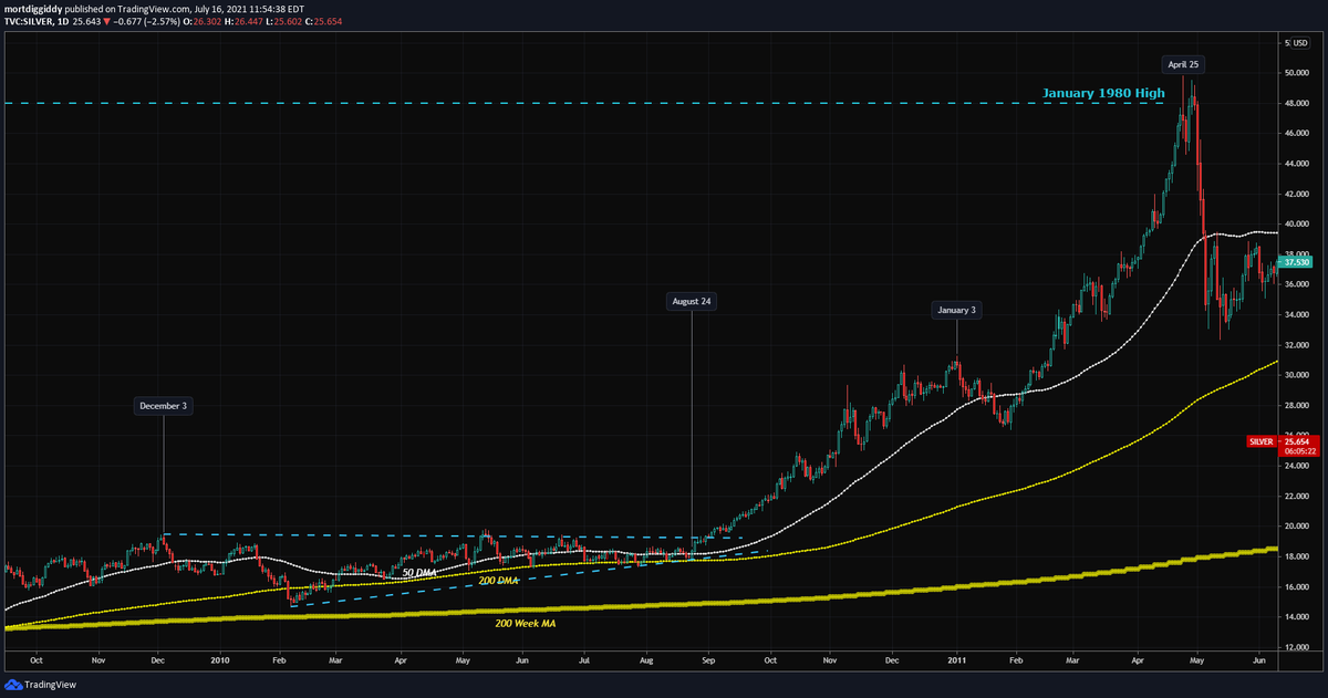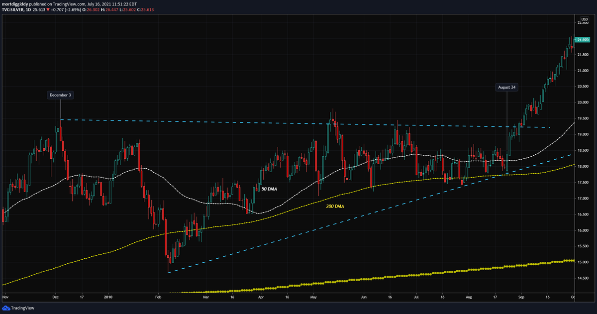 2010 had a shorter consolidation for silver, less than 1 year. The major rally that started the next year was still somewhere in August 2011.