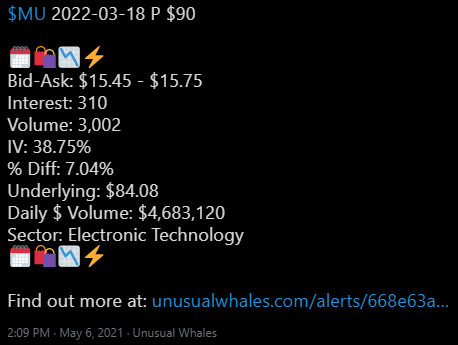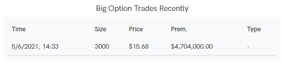 Once you've done so you'll you want to scroll down to where it says "Big Options Trades". In this case there is only one. "5/6/2021,14:33, Size 3000, Premium per $15.68, Total premium $4,704,000.00".