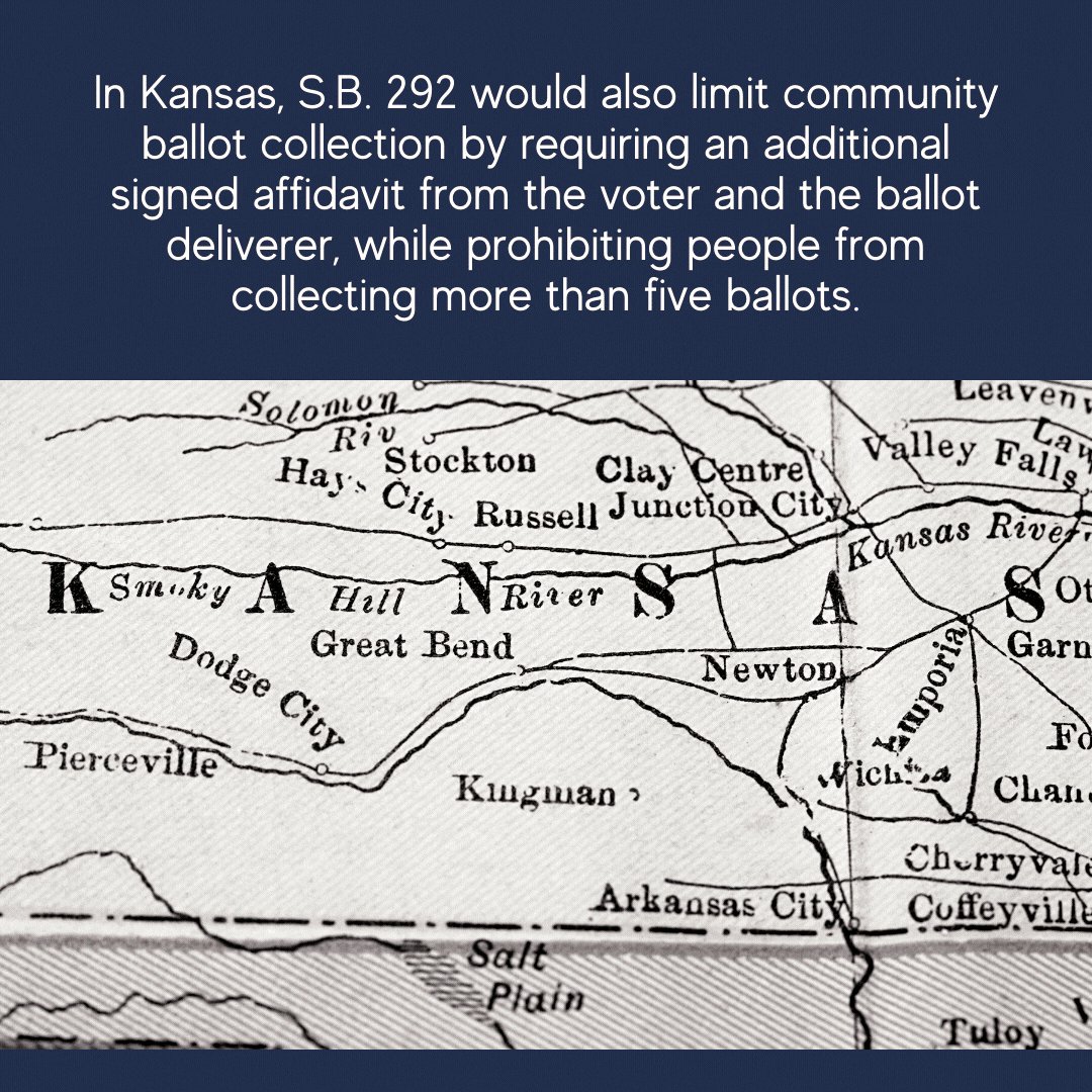 In Kansas, S.B. 292 would also limit community ballot collection by requiring an additional signed affidavit from the voter and the ballot deliverer, while prohibiting people from collecting more than five ballots. 11/