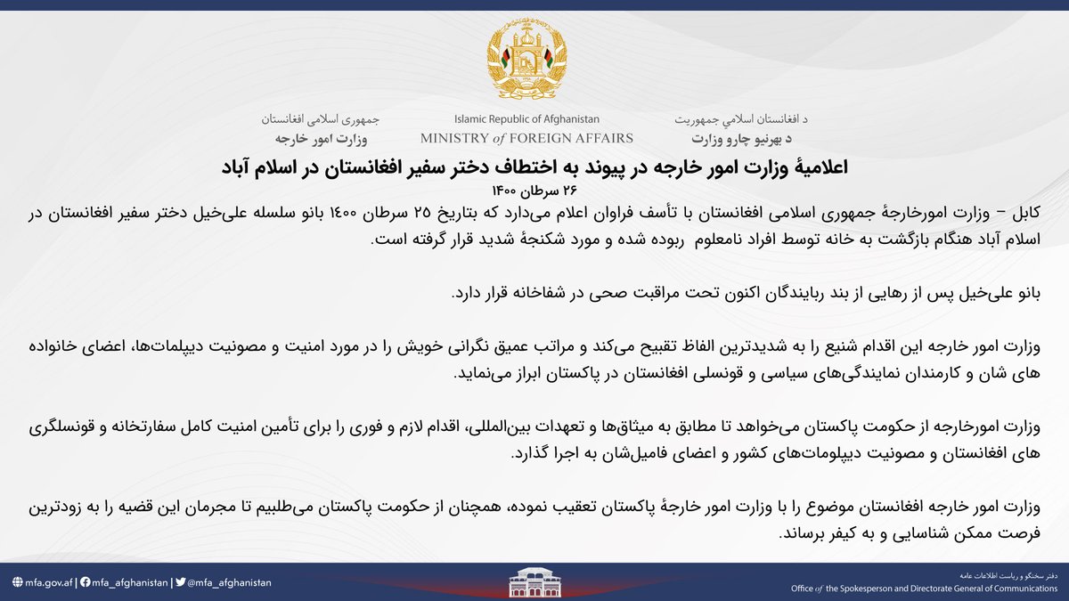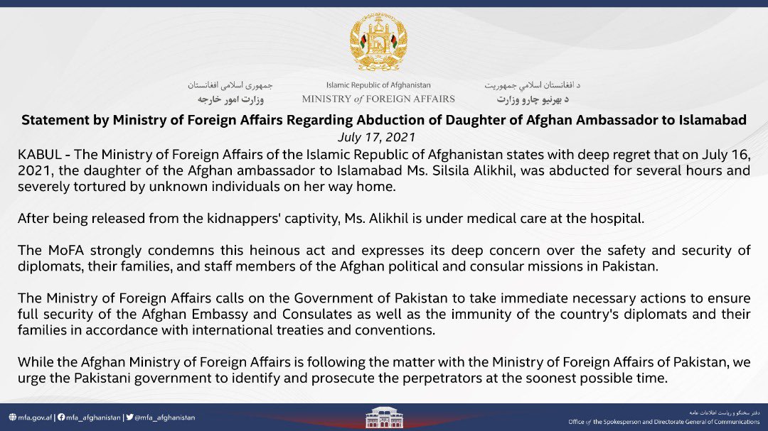 Statment by the #Afghanistan's Ministry of Foreign Affairs on the abduction/ Kidnapping of the daughter of the #Afghan ambassador to #Islamabad, #Pakistan.