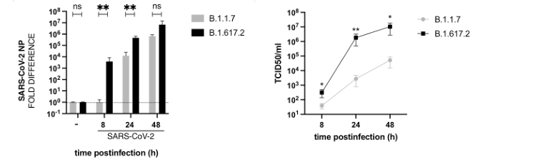 Taking replication we originally showed increased growth of Delta virus in vitro using airway organoids compared to Alpha. Now we show increased virus production in two other systems: Calu-3 epithelial lung cell lines (shown here) and airway epithelial cells (@wendybarclay11)