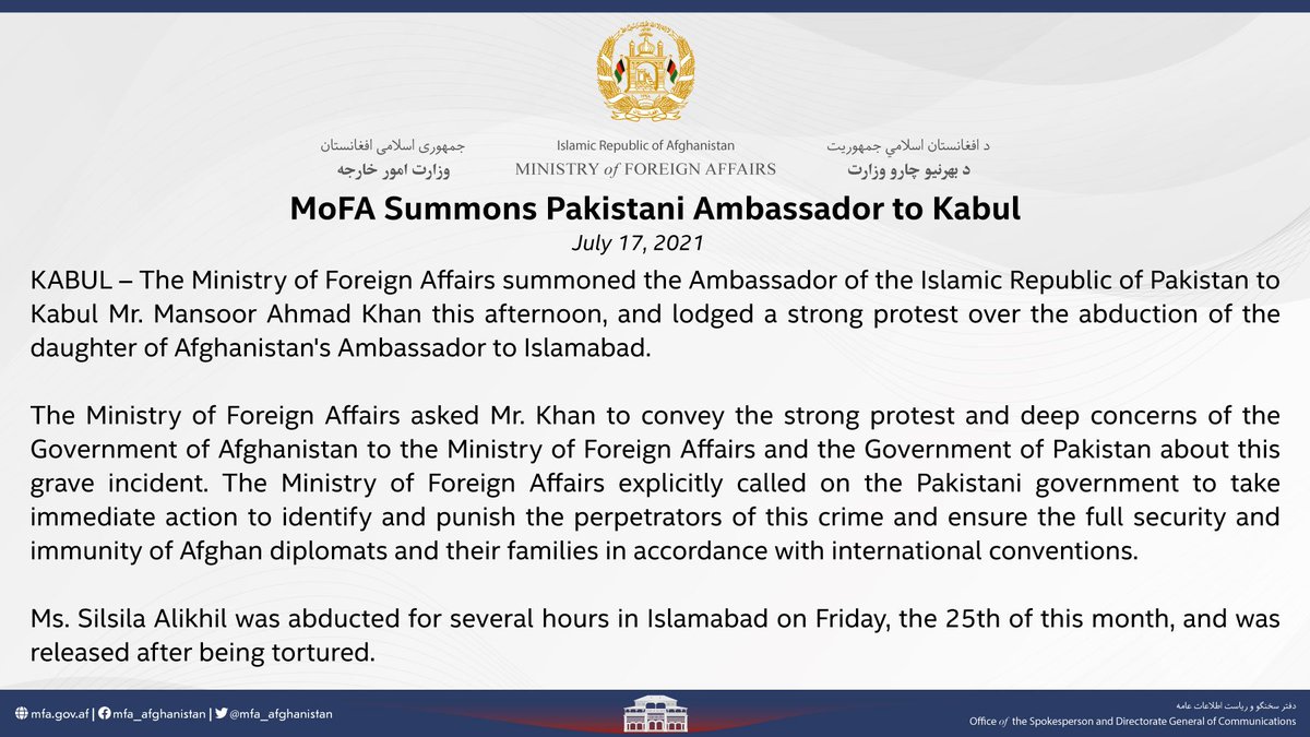 The Ministry of Foreign Affairs, Afghanistan summoned the Ambassador of the Islamic Republic of Pakistan to Kabul, Mansoor Ahmad Khan this afternoon and lodged a strong protest over the abduction of the daughter of Afghanistan's Ambassador to Islamabad.