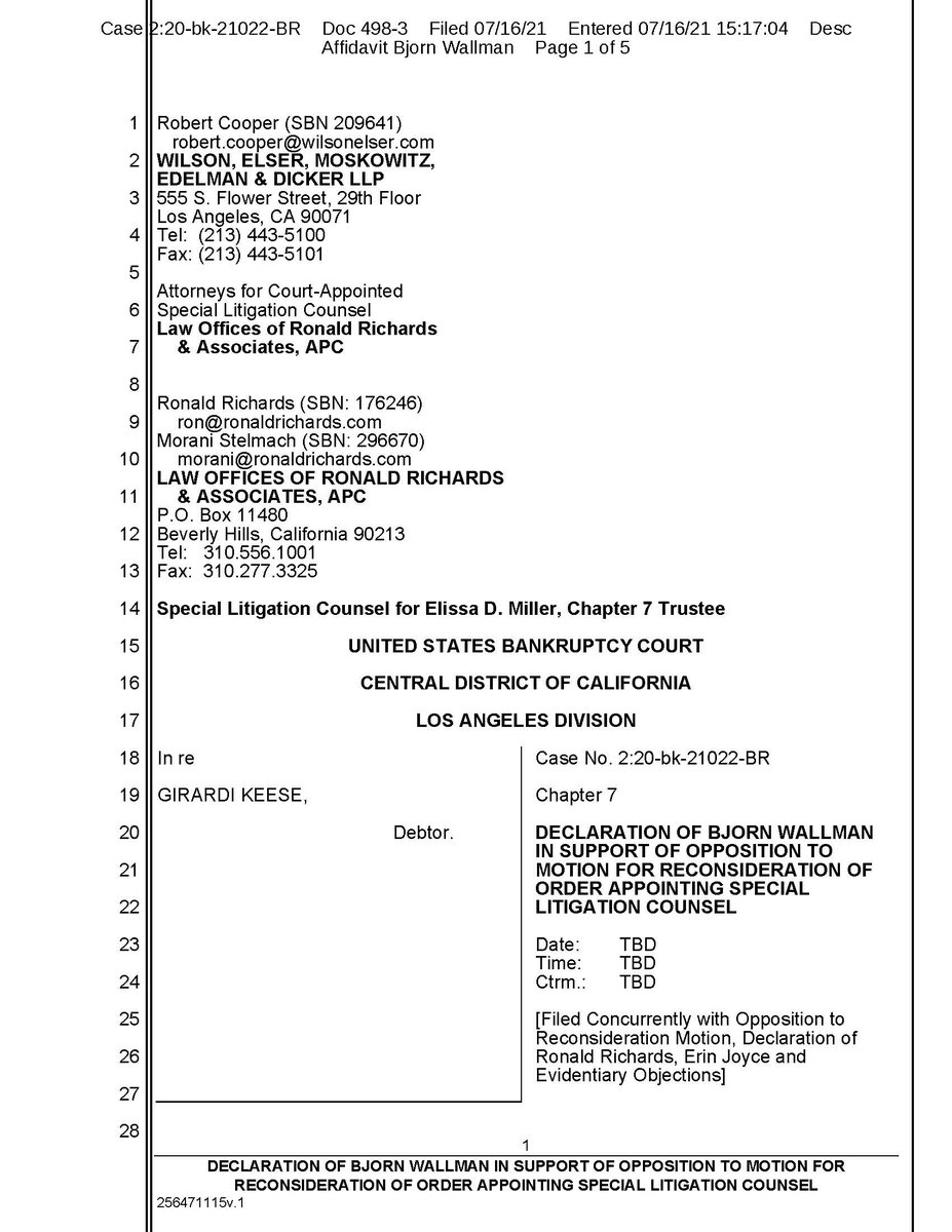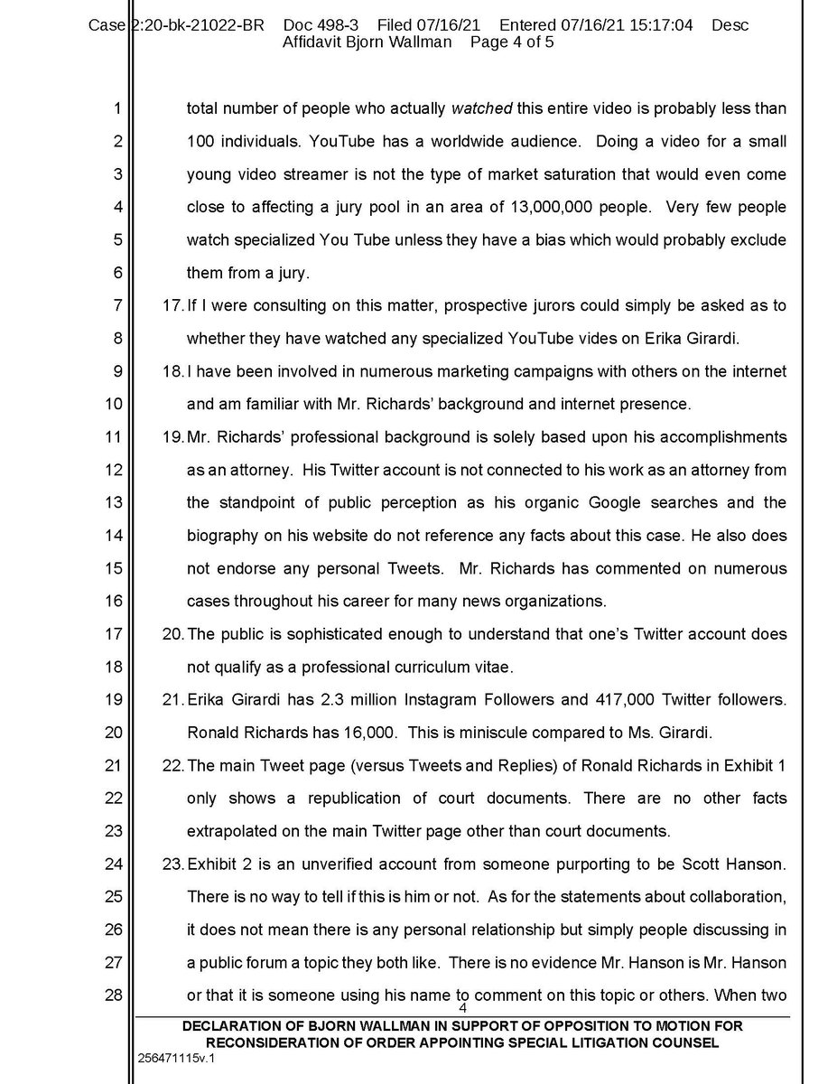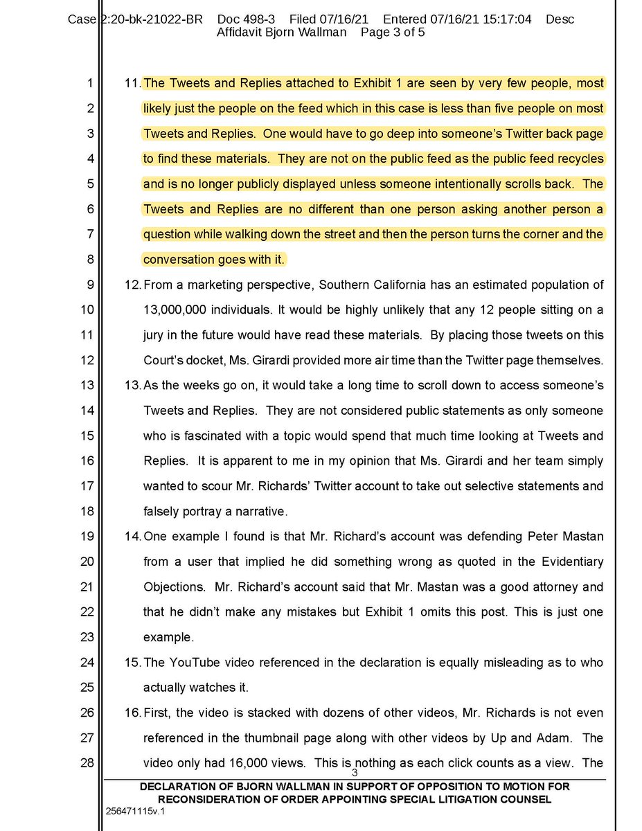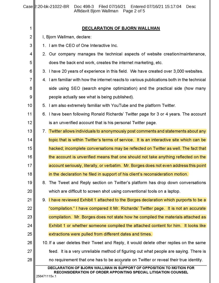 Facts don't become true simply because someone argues a position in a motion with inadmissible evidence. Here is parts of Bjorn Wallman's declaration which actually provided real testimony as to the facts and what a Twitter feed really is and how it is published and to whom...