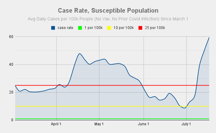 Here's the infection rate, which has risen from 0.76 at the end of May to 0.98 as of a week ago and are likely up to 1.09 now.