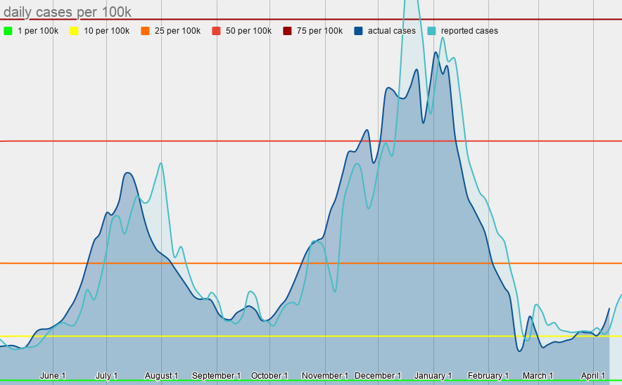 For those people, the case rate is 59.7 per 100k. (For context, that's equal to the overall case rate in mid-December - and higher than at any point last summer.)
