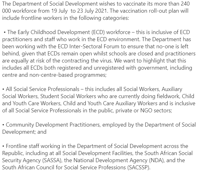 [Thread] 1. JUST IN: @The_DSD essential workers be vaccinated from Mon, 19 July: 1. Early childhood development (ECD) staff 2. Social workers (also auxiliary workers and students) 3. Community development practitioners 4. Frontline @The_DSD staff