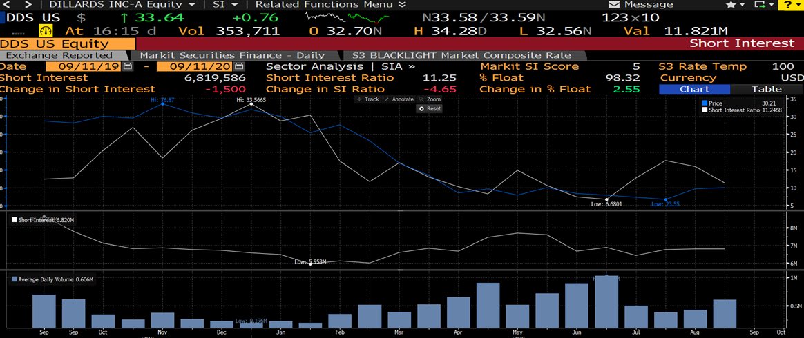 3) What matters today is that $DDS keeps buying back stock, setting up for a new squeeze. During July, they bought back 586,851 shares. By my math, between Aug 1 and Aug 29, they bough back another 267k shares. That means there are 18,366,790 Class A shares outstanding on Aug 29.