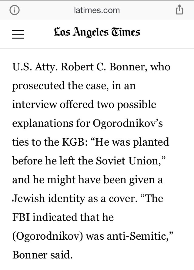 U.S. Atty. Robert C. Bonner, who prosecuted the case, offered two possible explanations for Ogorodnikov’s ties to the KGB: “He was planted before he left the Soviet Union,” and he might have been given a Jewish identity as a cover.