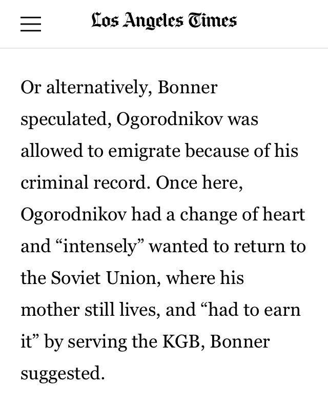 Or alternatively, Bonner speculated, Ogorodnikov was allowed to emigrate because of his criminal record. Once here, Ogorodnikov had a change of heart and “intensely” wanted to return to the Soviet Union, where his mother still lives, and “had to earn it” by serving the KGB…