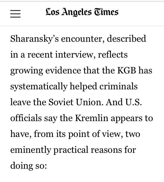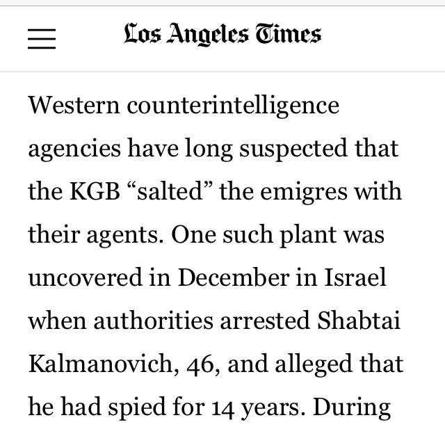 🚨Western counterintelligence agencies have long suspected that the KGB “salted” the emigres with their agents. One such plant was uncovered in December in Israel when authorities arrested Shabtai Kalmanovich, 46, and alleged that he had spied for 14 years.