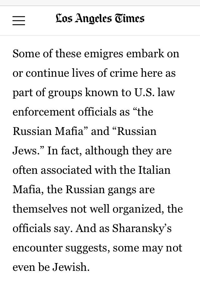 In fact, although they are often associated with the Italian Mafia, the Russian gangs are themselves not well organized [note: this is circa 1988], the officials say. And as Sharansky’s encounter suggests, some may not even be Jewish.