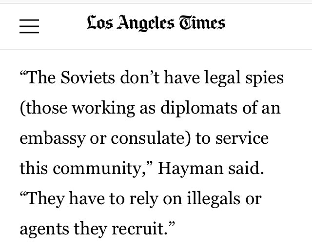 “The Soviets don’t have legal spies (those working as diplomats of an embassy or consulate) to service this community,” Hayman said. “They have to rely on illegals or agents they recruit.”